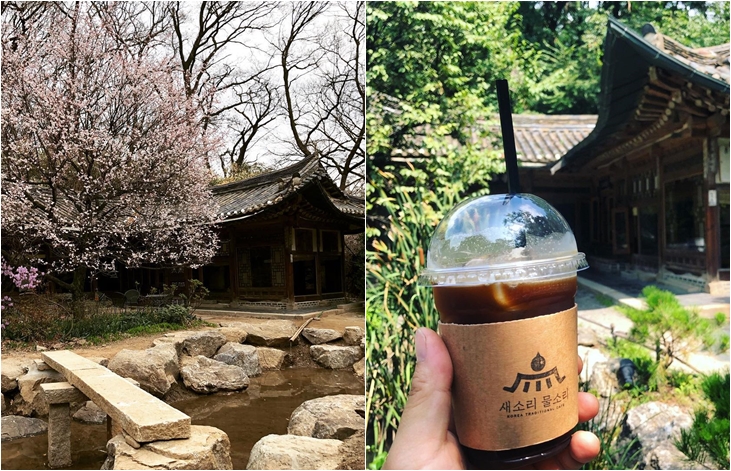 성남 오야동에 위치하고 있는 <새소리 물소리>는 절로 힐링이 될듯한 실내 연못이 위치한 옆 좌석이 제일 명당자리로 마당 연못과 함께 잘 꾸며진 정원 역시 봄의 기운을 느끼기에는 충분한 곳입니다. 특히 한옥 카페에서 즐길 수 있는 쌍화차, 대추차, 오미자차등 전통차와 더불어 단팥죽, 팥빙수, 경단 세트 등 다양한 전통 간식들을 즐길 수 있습니다.