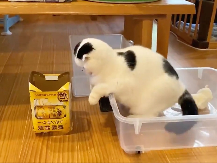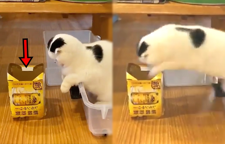 어느 날 네티즌이 키우던 고양이는 투명 플라스틱 케이스에 들어간 상태로 눈앞에 있는 빈 상자를 응시하고 있었다고 합니다. 그리고 이내 무슨 생각을 했는지 빈 상자로 점프를 했다고 합니다. 하지만 바퀴가 달린 케이스가 뒤로 밀리면서 그만 머리만 종이 박스에 낀 상태가 되었다고 합니다.