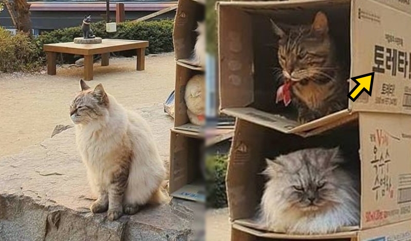 신기한 건 5층으로 쌓은 박스 안에 고양이들이 칸칸마다 들어가 있는 모습입니다. 5층짜리 고양이 아파트를 연상시키는 박스 주변에는 여분의 박스와 함께 고양이를 위한 담요까지도 보이고 있죠. 또 박스에 칸칸이 들어가 있는 고양이들과 다르게 박스 앞을 지키고 있는 고양이 한 마리도 있습니다. 네티즌들은 고양이 아파트를 지키는 경비라며 조심스럽게 추측들을 하고 있는데요.