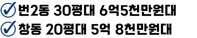 강북구 번2동 금호아파트의 경우 최근 매매가 기준 84m²(공급/전용 면적:34.5평/25.69평) 아파트가 6억원대에 매물이 나온 상황이죠. 노도강이라도 지역에 따라 매매가의 차이는 있지만 대다수의 아파트들이 6~9억 원대를 형성하고 있습니다. 물론 노도강 특성상 노후된 아파트가 많다는 점과 지하철 및 대중교통 이용이 불편하다는 단점은 있지만 서울시는 '2030 서울플랜'을 통해 창동, 상계 일대를 동북권의 광역적 중심지로 선정을 하면서 주변 개발과 동부선 경전철 등의 호재들이 있기 때문에 향후 더 오를 가치가 충분히 있다는 점에서 6억 원대 아파트를 찾고 계신 분들이 라면 눈여볼만한 지역이라고 할 수 있습니다.