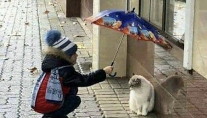 비 오는날 한 소년은 우연히 비를 피해 건물 모퉁이로 피해 있는 길냥이를 발견했습니다. 이에 자신이 쓰고 있던 우산을 길냥이에게 씌워줬습니다. 비를 피해 건물 모퉁이에 앉아 있던 길냥이가 아마도 소년은 불쌍하다고 생각을 했었던 거 같습니다.