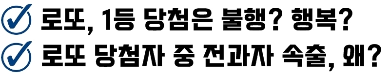 대한민국에서 로또는 일확천금의 기회로 누구나 매주 토요일의 행운을 기대하며 한주를 버틴다는 말이 있는 것처럼 하루아침에 합법적으로 돈방석에 앉게 해주는 기회라고 믿고 계시는 분들이 많습니다. 하지만 로또 1등 당첨자들 중 현실적으로 로또로 인해 행복해졌다는 사람도 있지만 비극적인 결말을 맞이한 사람들도 있죠.