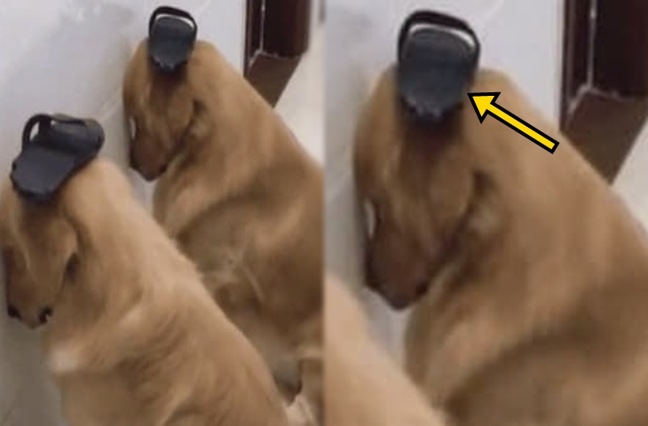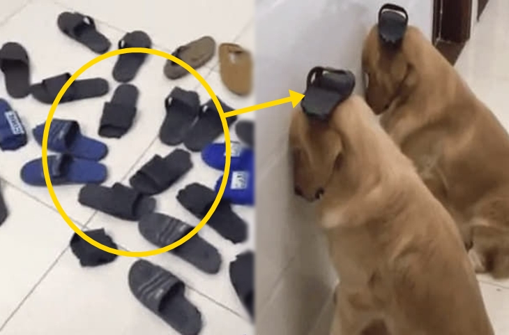 이에 네티즌은 결국 특단의 조치로 사고를 친 골든 레트리버 형제들에게 벽을 보고 반성하도록 했죠. 그리고는 각각 머리에 장난을쳐 망가트린 슬리퍼 한짝을 올려놨습니다. 신기한건 벽을 보고 반성을 정말 하고 있는듯 리트리버 형제들이 시무룩하게 벽에 머리를 기대고 있었다는 점이었습니다.