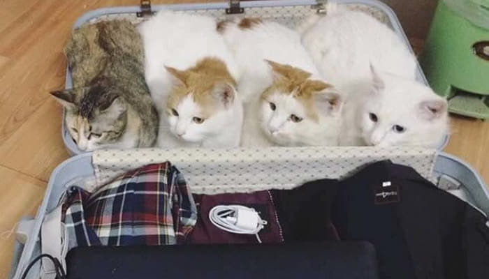 네티즌은 여행을 떠나기 전날 캐리어에 휴대폰 충전기, 노트북 및 옷가지 등을 여행용 캐리어에 한가득 챙겼습니다. 그리고 그 모습을 바라보고 있던 고양이 4마리는 차례대로 캐리어에 반대편 공간에 나란히 들어가 앉았습니다.