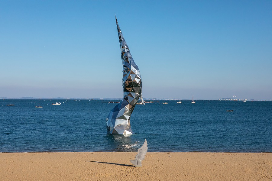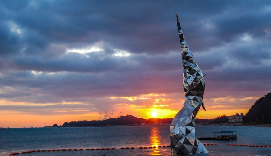 포항을 생각하면 많은 분들이 호미곶을 생각하실 겁니다. 호미곶에는 랜드마크로 할 수 있는 상생의 손이 있죠. 왜목마을 역시 '새벽왜목'이라는 조형물이 왜목마을의 랜드마크 역할을 하고 있습니다. 꿈을 향해 비상하는 왜가리의 모습을 상징하는 조형물로 스테인리스 스틸판에 주변 환경의 색이 그대로 비춰 시간에 따라 다양한 색상을 연출해 특히 일몰과 일출 시 낭만적인 분위기를 연출하고 있습니다.