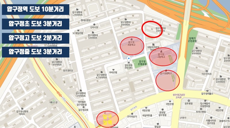 압구정동에서 공인중개사를 하고 있는 한 관계자는 "압구정 아이들은 해외유학과 특목고 진학이 많기 때문에 대치나 반포보다는 교육적으로 덜 주목받았지만 진짜 찐 '학 테크'는 여기 다 있다."며 "탯줄부터 명품 인맥에 투자하려는 맹모들의 이주 수요가 끊이질 않는다."라고 이야기를 하고 있습니다. 실제로 부동산 빅데이터 기업 아파트 실 거에 따르면 강남구에서 특목고 진학률이 가장 높은 곳은 압구정 중학교(8.8%)로 나타났으며, 국, 영, 수 성취도가 97.6%로 서울 평균에 비해 20%나 높은 것으로 나타났습니다.