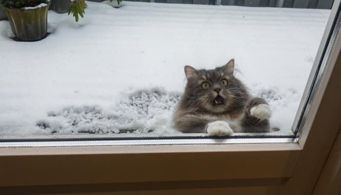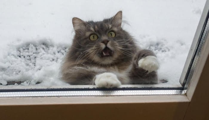 해외 커뮤니티 '레딧(reddit)'에 공유된 사진은 추위에 절규하고 있는 고양이의 표정이 리얼하게 담겨 있습니다. 공개된 사진 속에 등장하는 고양이는 두 눈을 동그랗게 뜬 채로 솜방망이를 두들기며 집사 보고 빨리 문을 열어달라고 애원을 하고 있는 모습이죠.