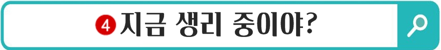 이 질문에 대해서 "그래" "응 하고 있어"라는 등 그 어떠한 대답도 사실은 중요하지 않습니다. 여자들의 경우 폐경기가 아닌 이상은 주기적으로 그날이 찾아오는 건 너무나도 당연한 일이라고 할 수 있는데요. 하지만 아무리 주기적으로 찾아와도 이 날만 되면 여자들은 옷차림부터 시작해 냄새 등 온갖 신경이 예민해지기 시작하는 타이밍이죠. 이런 상황에서 남자 친구의 그 한마디는 여자들로 하여금 "냄새가 나는 건가?" "혹시 비치나?"등 온갖 상상들을 하게 만드는 질문이기 때문에 이런 질문은 피하는 게 좋습니다.
