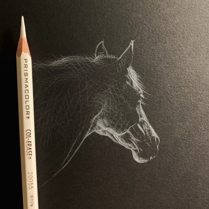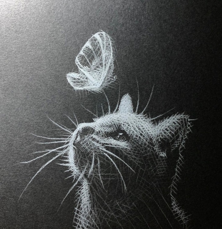 하얀 선으로만 그려진 그림에도 불구하고 선의 굵기, 겹쳐진 정도에 따라 다양한 형태와 질감 그리고 미묘한 색감 차이까지도 섬세하면서 디테일하게 표현을 하고 있죠. 특히 이런 검은 바탕에 하얀 선으로 그린 작품들의 매력적인 특징은 전체적인 묘사를 하지 않아도 사실적으로 표현된다는 점에서 놀라움을 주고 있습니다. 모든 그림을 다 그려야 한다는 상식을 뛰어넘어 일부만 선으로 표현해도 작품을 이해할 수 있다는 점에서 네티즌들 사이에서 화제가 되었는데요. 그렇다면 과연 그녀가 하얀 색연필로만 그린 그림들의 모습은 어떨까요?
