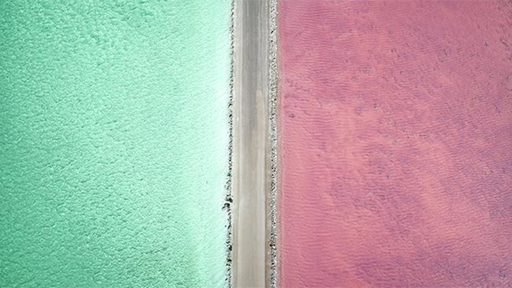 수박바를 닮은 호수는 남호주 중에서도 절경으로 손꼽히는 '에어 페닌슐라(Eyre Peninsula)'에 위치한 '맥도넬 호수(Lake MacDonnell)'로 가운데 도로를 중심으로 한쪽은 분홍빛 물결이 또 다른 한쪽은 푸른색 물결이 흘러 막 찍어도 인생 사진을 수두룩하게 건져 올 수 있다고 알려진 신비의 호수라고 하는데요. 모래사장처럼 길게 늘어선 도로를 중심으로 양 옆으로 핑크색을 띤 호수, 그리고 반대편으로는 초록색의 바다가 정확히 반반으로 갈라져 장관을 연출하고 있습니다.