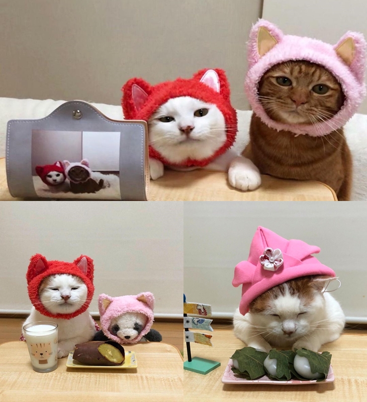 일본에서 고양이 여러 마리를 키우고 있는 한 네티즌은 자신의 SNS 계정(@kibimomo/instagram)을 통해 붕어빵 모자 이외에도 다양한 형태의 모자를 쓰고 있는 고양이 사진들을 공유했습니다.