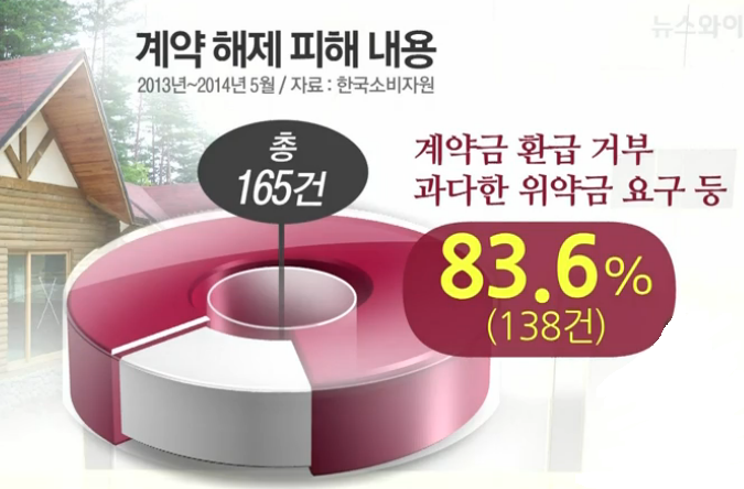 소비자보호원에 접수된 펜션 관련 상담의 83.4%는 위약금 및 환불 관련 불만이었는데요. 주요 포털사이트 상위에 검색되는 100개 펜션의 경우 소비자분쟁해결기준의 환불기준을 지키는 업체는 단 한 곳도 없었으며 펜션 운영 업체마다 분쟁 기준에서 제시하는 규정보다 소비자에게 불리한 환불기준을 정해놓고 있어 소비자들의 불만은 커질 수뿐이 없습니다. 실제로 한 사연자는 예약 홈페이지에 있던 취소 환불 규정 이외에도 별도로 취소 수수료를 요구했다는 사연을 공유해 많은 네티즌들의 공분을 산적도 있었습니다.