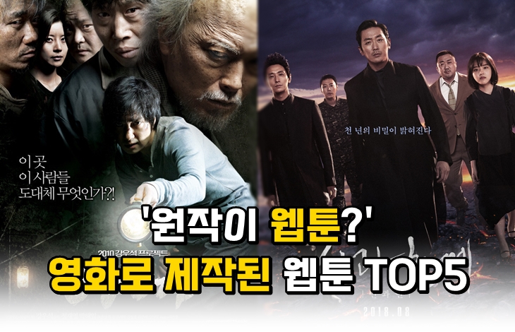 그만큼 많은 이들에게 각인을 시켜준 웹툰 작품들이 많습니다. 이에 영화계에서도 꾸준히 웹툰을 기반으로 한 영화 및 드라마들을 제작하게 되었죠. 그래서 오늘은 웹툰을 원작으로 제작된 한국 영화 중 흥행 순위 TOP 5를 알아보려고 하는데요. 과연 웹툰을 원작으로 제작된 영화 중 흥행에 성공한 작품에는 어떤 작품들이 있는지 함께 살펴보도록 하겠습니다.