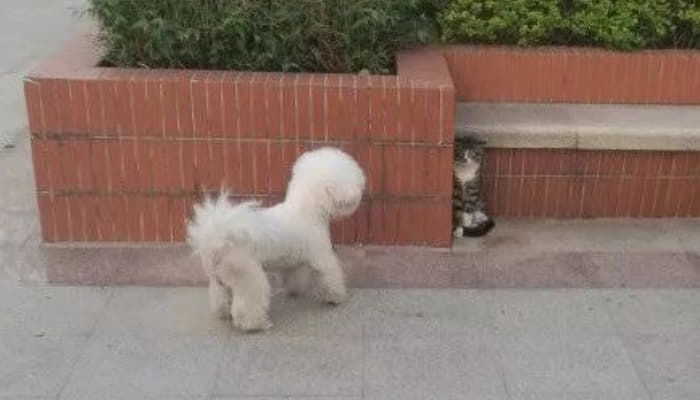 사연은 이렇습니다. 주인 할아버지와 함께 산책을 나섰던 강아지는 산책 도 중 우연히도 길고양이를 마주치게 되었습니다. 이에 산책 중인 강아지는 마치 친구라도 만난 듯 꼬리를 치며 반가움에 길고양이에게 다가섰습니다.