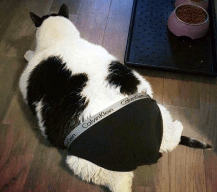 아마도 살이 너무나도 찐 고양이의 모습을 본 집사가 자신의 속옷을 입혀보면 맞을 거 같다는 생각에 고양이에게 입혀 본거 같은데요. 평소와 같으면 전혀 맞지 않았겠지만 지나치게 살이 찐 고양이로 인해 캘빈클라인 속옷이 고양이에게 딱 맞으면서 웃음을 자아내게 하고 있습니다.