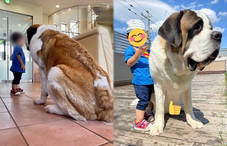 세인트 버나드를 본 아이는 그 크기에 놀랄 법도 하지만 어려서부터 강아지들과 함께 자라 서였는지 거부감은 물론이고 두려워하지 않았다고 하죠. 네티즌이 공개한 사진을 보면 실제로 세인트 버나드와 함께 즐거워하는 아이의 모습을 볼 수 있는데요. 그런 아이를 보면서 강아지 역시 덤덤한 표정을 짓고 있습니다.
