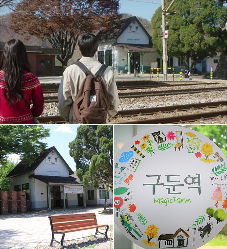걸그룹 멤버였던 '수지'를 일약 '국민 첫사랑'으로 만들었던 영화 건축학개론에 등장했던 구둔역은 2012년 철길이 폐선돼 현재 기차가 지나다니지 않지만 아직도 자연과 어우러진 아름다운 풍경을 자랑하고 있는 폐역으로 건축학개론에서 기찻길 데이트 장면의 촬영지 이외에도 엄태웅, 려원 주연의 '네버엔딩 스토리'에 등장하면서 화제가 되었죠. 구둔역 안쪽에는 소원을 들어준다는 '소원나무'가 있으며, 아담한 역사와 화단, 연못 등이 어우러진 풍경이 정겹게 다가와 첫길 역에서 자연스러운 사진을 찍을 수 있는 곳으로 알려져 있습니다.