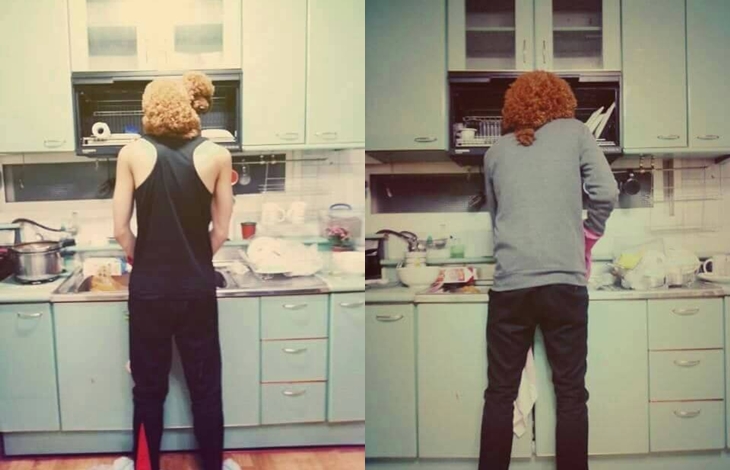 한 네티즌은 SNS 계정을 통해 '설거지할 때마다 목마 타는 댕댕이'라는 제목과 함께 여러 장의 사진을 게시했습니다. 게시된 사진을 보면 풍성하게 갈색으로 염색 후 파마를 한 듯한 남성이 등장을 하고 있죠.